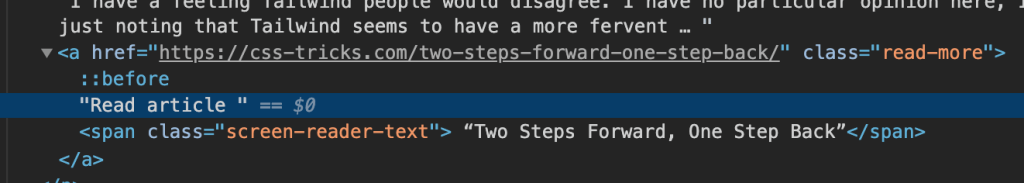 Most screen readers allow the user to quickly see a list of links on a page [..] However, if every link has text saying “Click here” or “Read more”, with nothing else to distinguish them, this is useless. The easiest way to solve this is simply to write unique link text, but if that isn’t possible, you can over-ride the link text for assistive technology by using a unique aria-label attribute on each link.