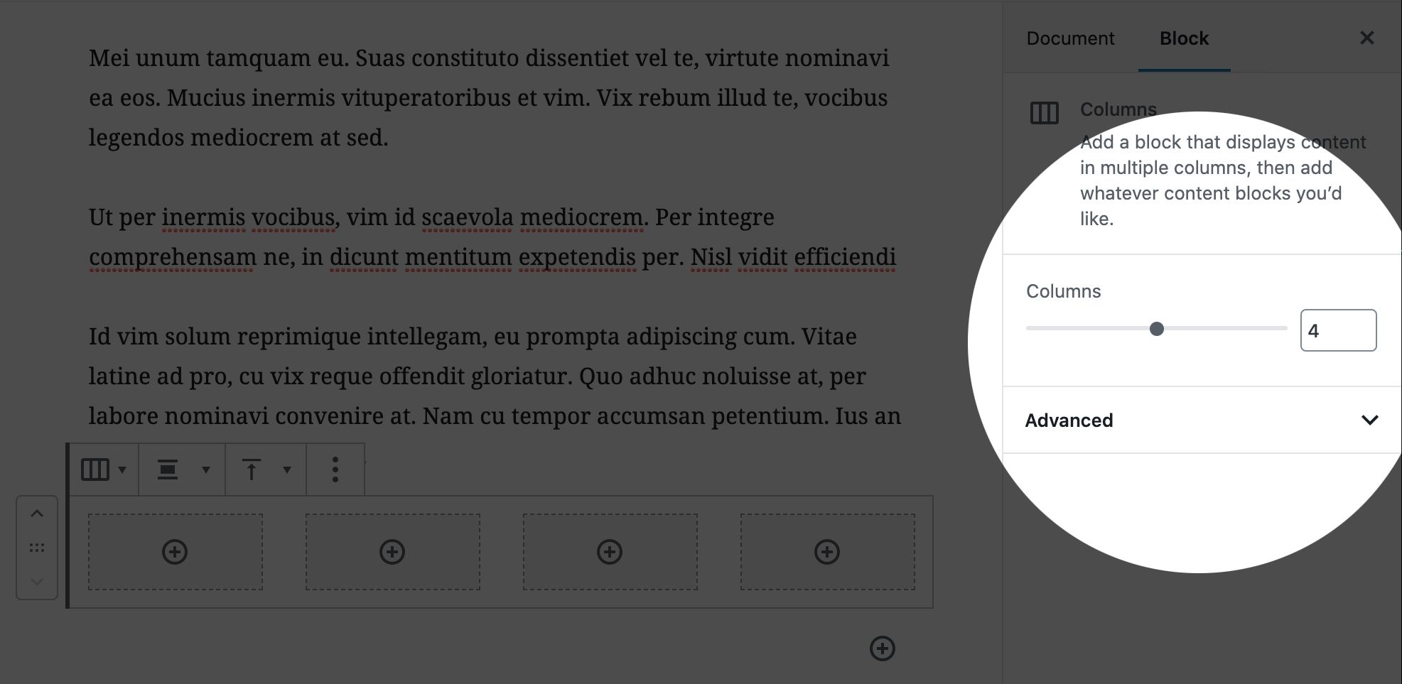 Let’s say you use a four-column layout on your website as often as you use two-column one. That’s unfortunate, because there is no shortcut button to create four-column layout. Creating one is a bit annoying because it takes extra clicks to get to the Columns control after the block is inserted: