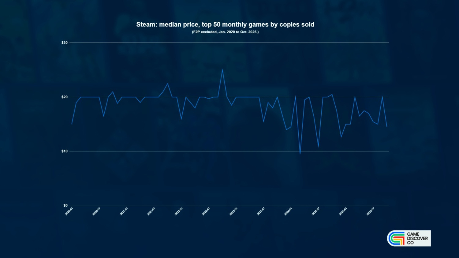 The median game price starts at $23.70 (Feb. 2023) and ends at $20.35 (Oct. 2025), down 14% (a tad less than the ‘copies sold’ result!)