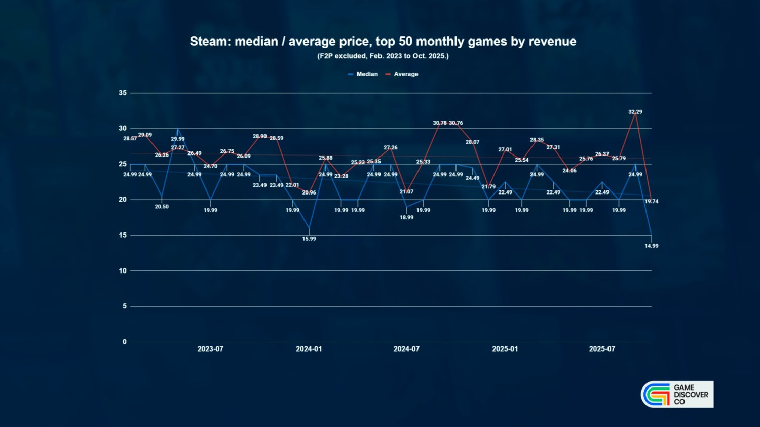 The average Steam Top 50 (by launch revenue) game price starts at $26.20 (Feb. 2023) and ends at $25.76 (Oct. 2025), down 2%.