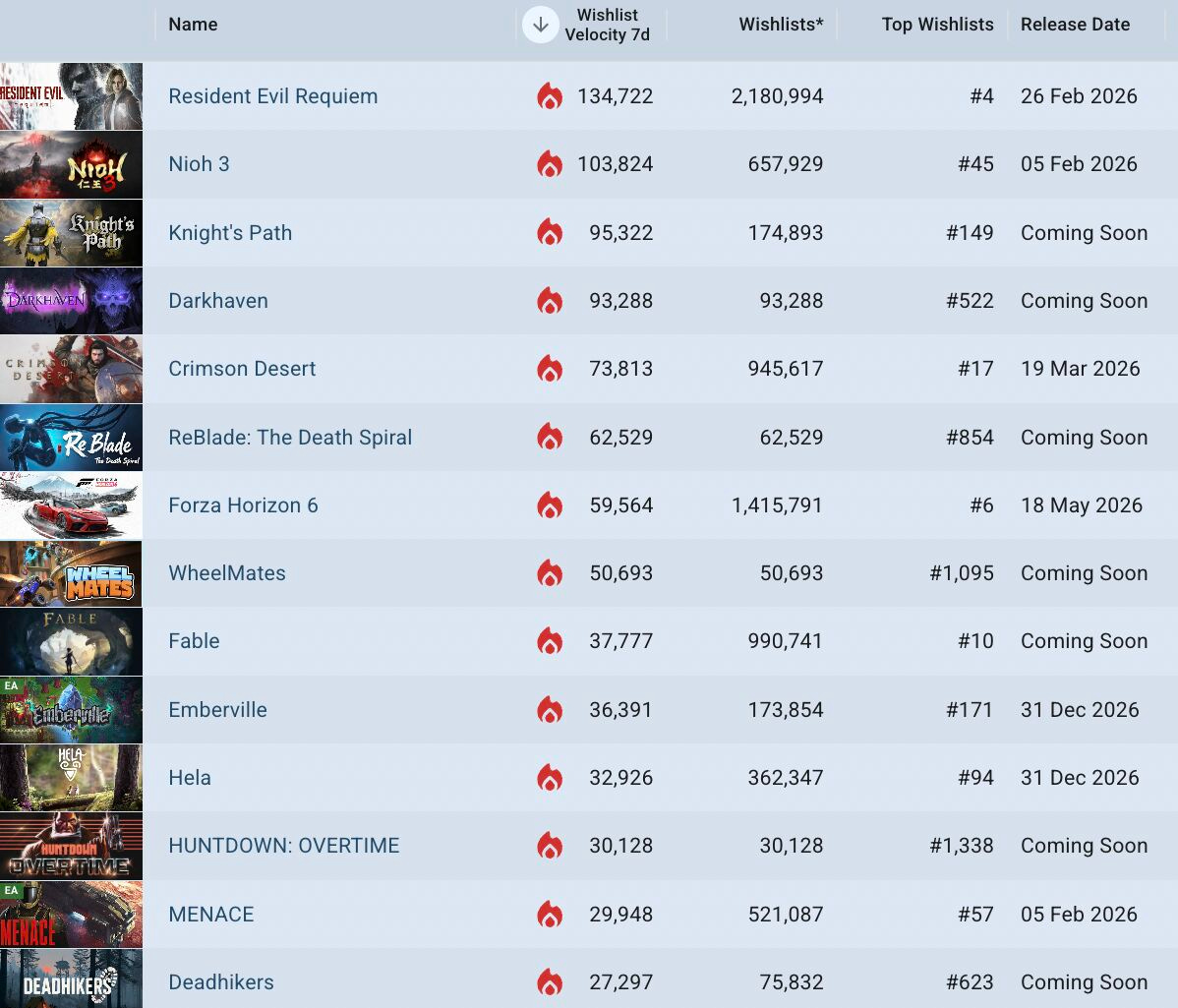 According to GDCo Pro's 7-day unreleased Steam game wishlist charts (Jan 19th-26th), Resident Evil Requiem (#1) added 135k wishlists this week, with momentum from samurai slasher sequel Nioh 3 (#2), out this week, and more interest in v.indie medieval-ish combat ARPG Knight's Path(#3).