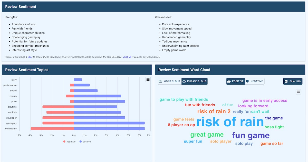 Putting all that launch data through GDCo Pro’s Steam review sentiment analysis box, we do indeed see a lot of that in microcosm - a lot of Risk Of Rain 2 mentions in the phrase-based word cloud, in particular: