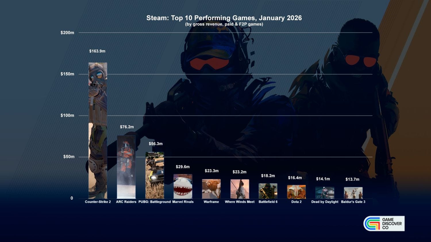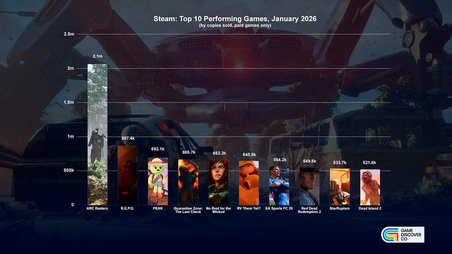 Moving into the overall top Steam games in January 2026 by paid units, it’s Embark’s extraction shooter ARC Raiders which is blasting it. GDCo has it at 2.1m Steam units for the month (and 3.8m for Jan. including console, hitting 15m units lifetime):