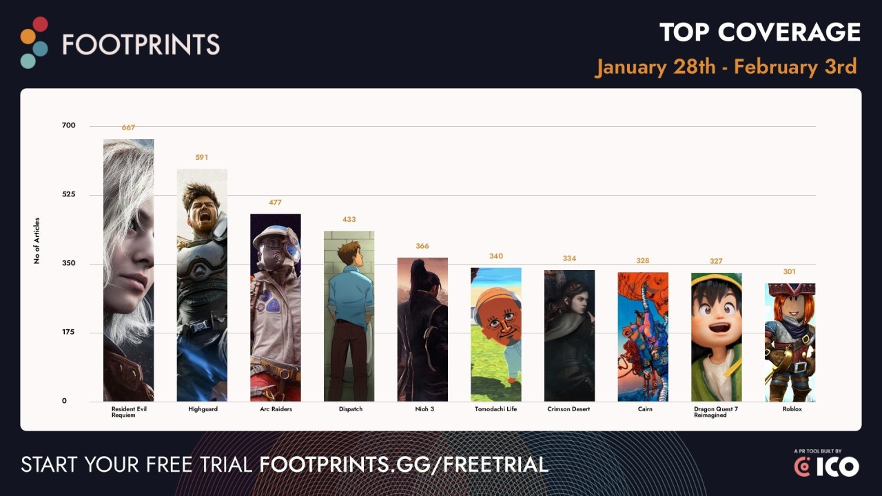 Checking the latest ‘trad media’ mentions from ICO’s Footprints.gg, Resident Evil Requiem continues super-strong momentum ahead of its Feb 27th release, as aftershocks from Highguard’s messy Steam launch continue, and Arc Raiders (new patches) and Dispatch (new Switch versions) also cause susurrus.