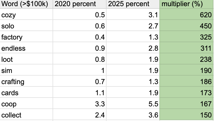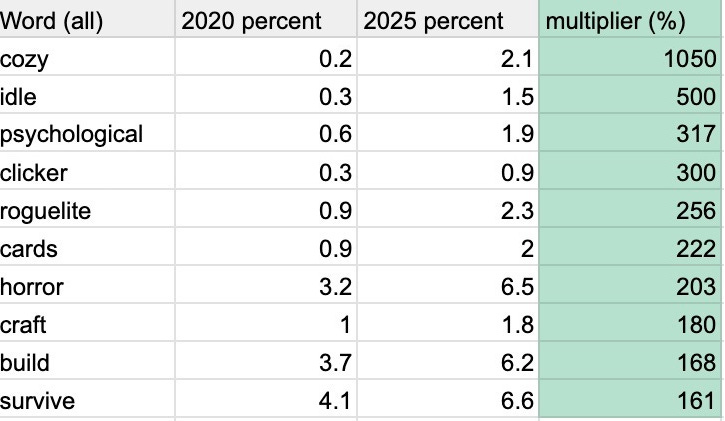 Here’s what we’re doing, as I explained it to one of my colleagues: “Take the current capsule descriptions* for ALL Steam games, and all games that have >$100k revenue (lifetime) that launched from 2020 to 2025… look at each word mention as a % of that year’s new game descriptions.” (*’Capsule description’ is the short paragraph under the game icon!)