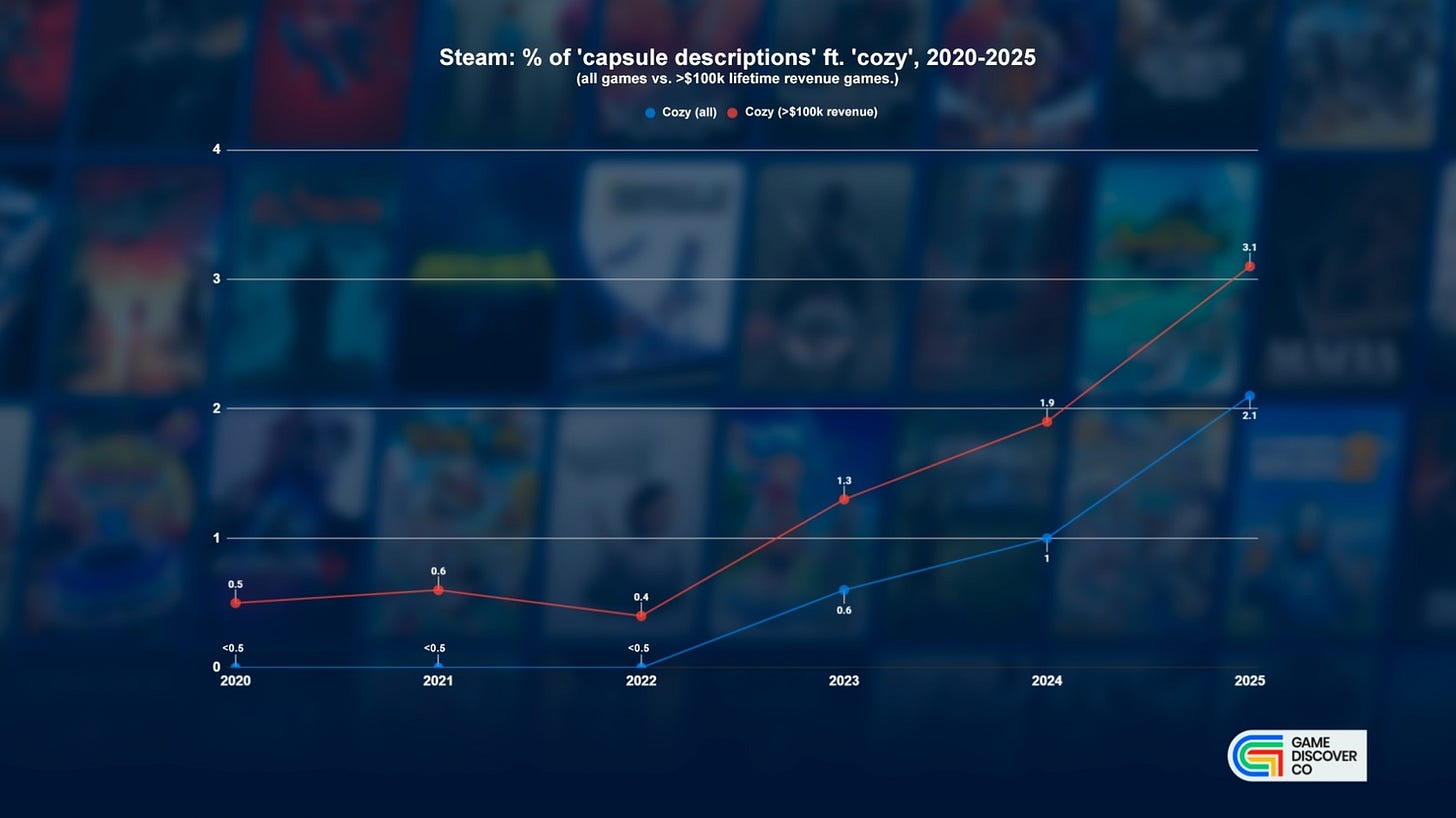 When it comes to ‘cozy’ games, there’s been an interesting - but much more linear - change. New games that admit they are cozy in the description went from 0.4% (2022) to 3.1% (2025) for titles that gross >$100k LTD. (And a similar, but slightly smaller percentage of all games.)