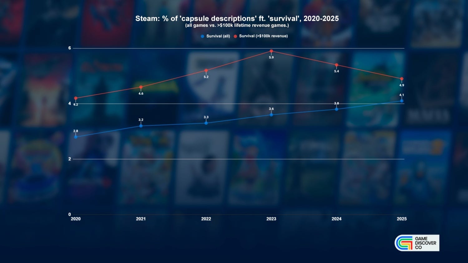 What does this imply? Possibly that 2023 was the best year to release a self-styled survival game, but the genre/theme/word is still a very fertile one. (4.9% of all >$100k games in 2025 is high, more than for ‘cozy’, and only just behind ‘co-op’.)