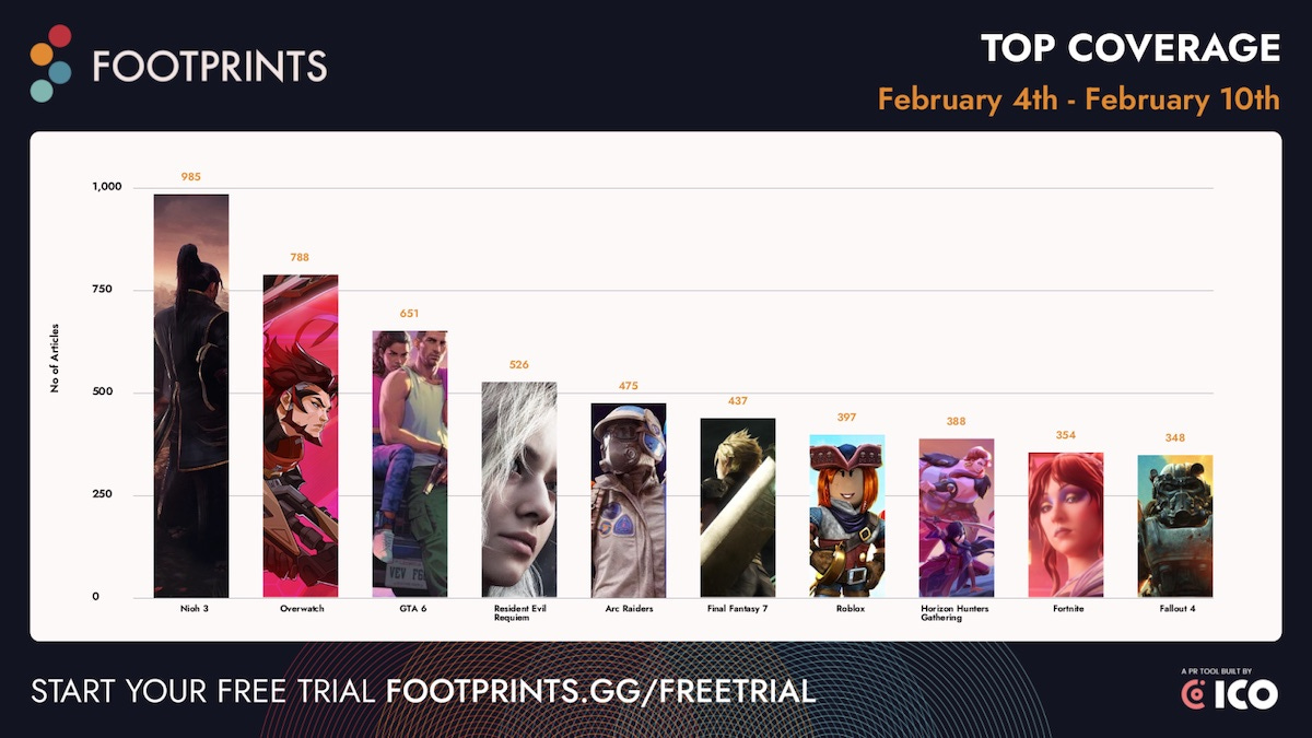 The latest‘trad media coverage’ charts from ICO’s Footprints.gg(above) are headed by the just-launched samurai ARPG sequel Nioh 3 at #1, followed by Overwatch at #2 (thanks to Blizzard’s decision to rename Overwatch 2), Grand Theft Auto 6 (generalized overexcitement?), Resident Evil Requiem & ARC Raiders.