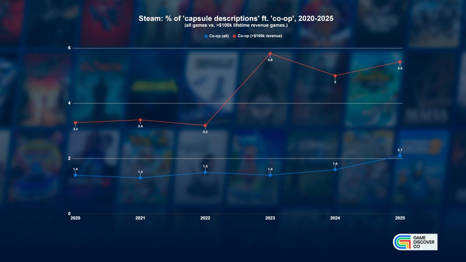 But the percentage of all games using the word co-op went up a tad slower - tho it’s latterly surging and is up by half from 1.4% (2023) to 2.1% (2025). What does this mean? Perhaps that making co-op games is hard(er), but those who can reap the dividends…