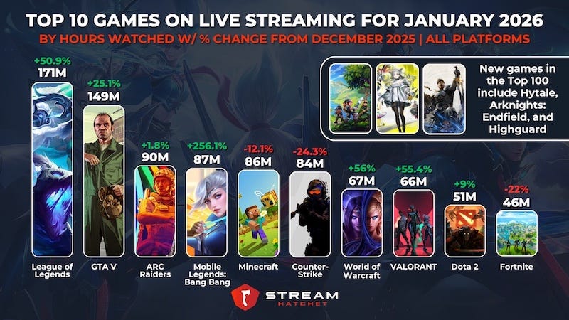 Hytale & Arknight: Endfield were the standout new Jan. releases: off-Steam Minecraft-ish PC release Hytale hit #22 with 18.3m hours watched, even in early release form. And mobile/PC ARPG gacha title Arknights: Endfield debuted at #29, with 10.9m hours watched.