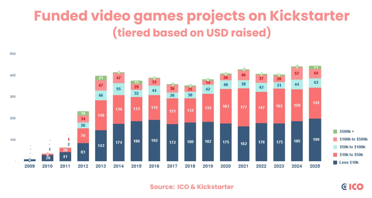 But ICO’s Thomas Bidaux is close to Kickstarter, and has managed to get a full 17-year set of data from the platform for a new blog post he’s made. And the results are pretty interesting, with both 2024 and 2025 seeing ~$26 million raised for games on KS.