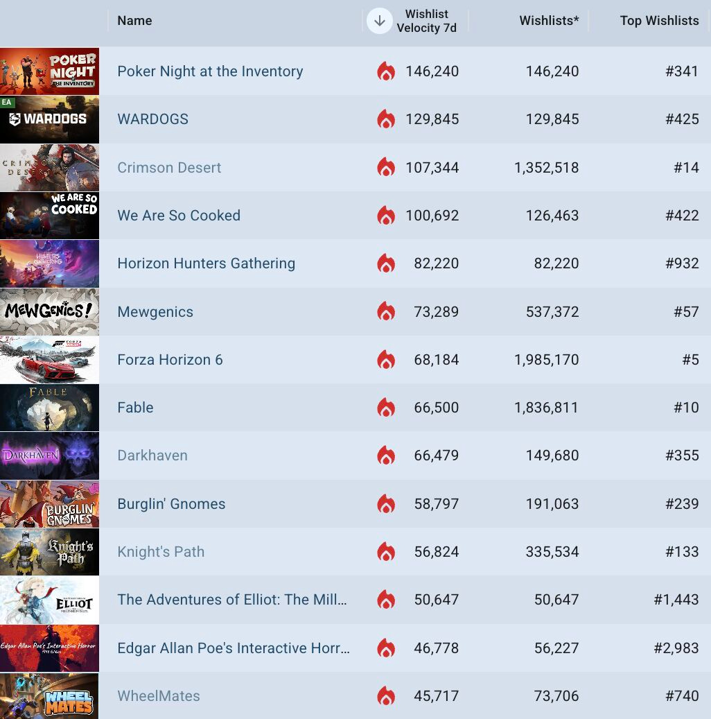 Elsewhere, co-op physics-stealth game We Are So Cooked(hide the body!) also has a strong start at #4, and Guerrilla’s multiplayer franchise continuation Horizon Hunters Gathering(#5) is also hotly awaited by players. Also notable: a strong surge for cat-heavy tactical RPG Mewgenics (#6), out today and looking huuuge.