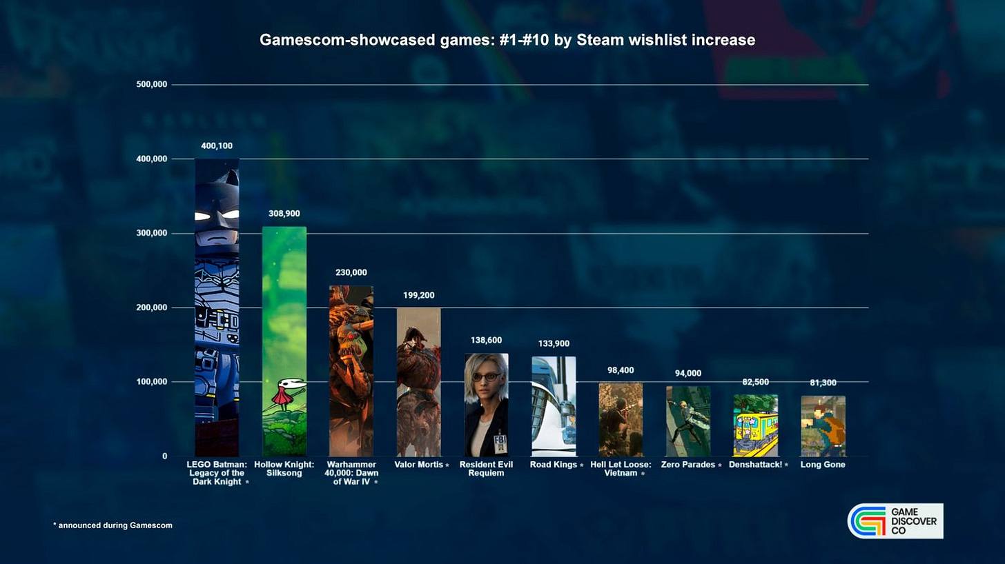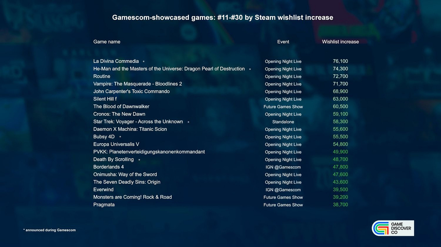 Gamescom 2025 featured multiple streaming showcases & announcements. So which not-yet launched games got major Steam wishlist & follower boosts? We know! GDCo has a giant database(Google Drive link) ranking the 100+ ‘showcase-featured’* unreleased games. (*With a couple of exceptions - hi, Star Trek Voyager strategy game!)