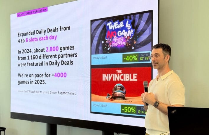 Steam sales & new users continue to push upwards: Peterson noted that from August 2024 to August 2025, the daily average was 109,000 new accounts buying games on Steam (so ~40m new accounts!) And the 2025 Spring Sale was up 19% - and the Summer Sale up 8% year-over-year - in revenue across discounted titles.