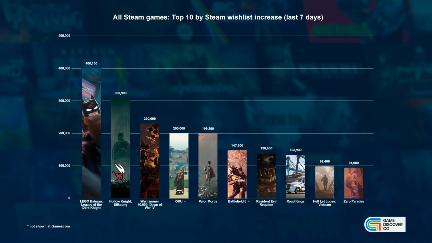 As you can see, the only non-Gamescom titles in there are OKU (still pushing the boundary of ‘incented wishlists’ from Bongo Cat, lol!) and Battlefield 6, in the middle of a very successful pre-order campaign. (We have it at 750k Steam pre-orders and $50m, way ahead of Borderlands 4 and Metal Gear Solid Delta in the pre-order charts.)