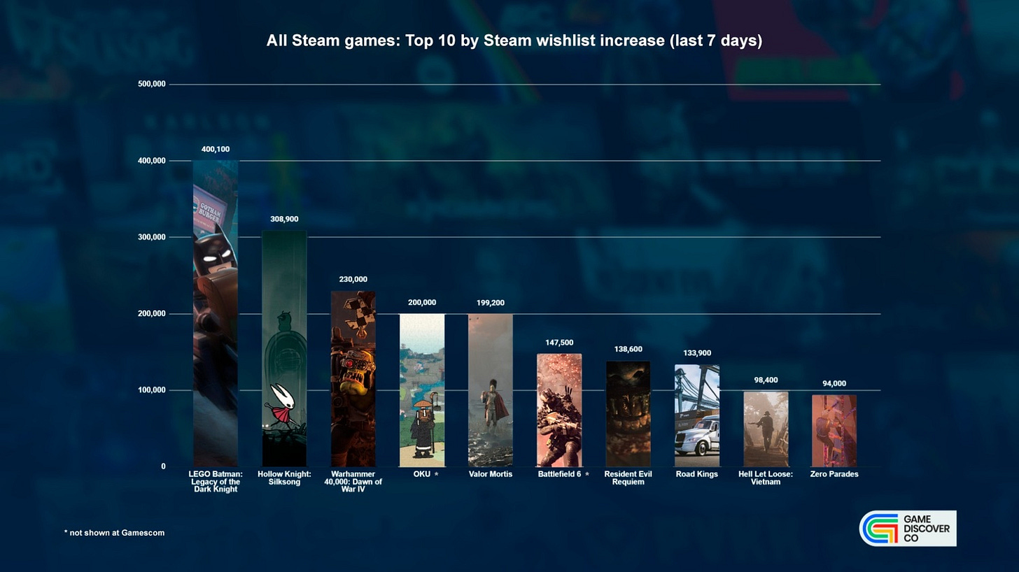 New looks at much-anticipated titles also hit the Top 10: yes, Hollow Knight Silksong added >300k wishlists (#2) on its release date announce, and Resident Evil Requiem (#5) topped 1m wishlists overall, after debuting a new trailer at Opening Night Live.