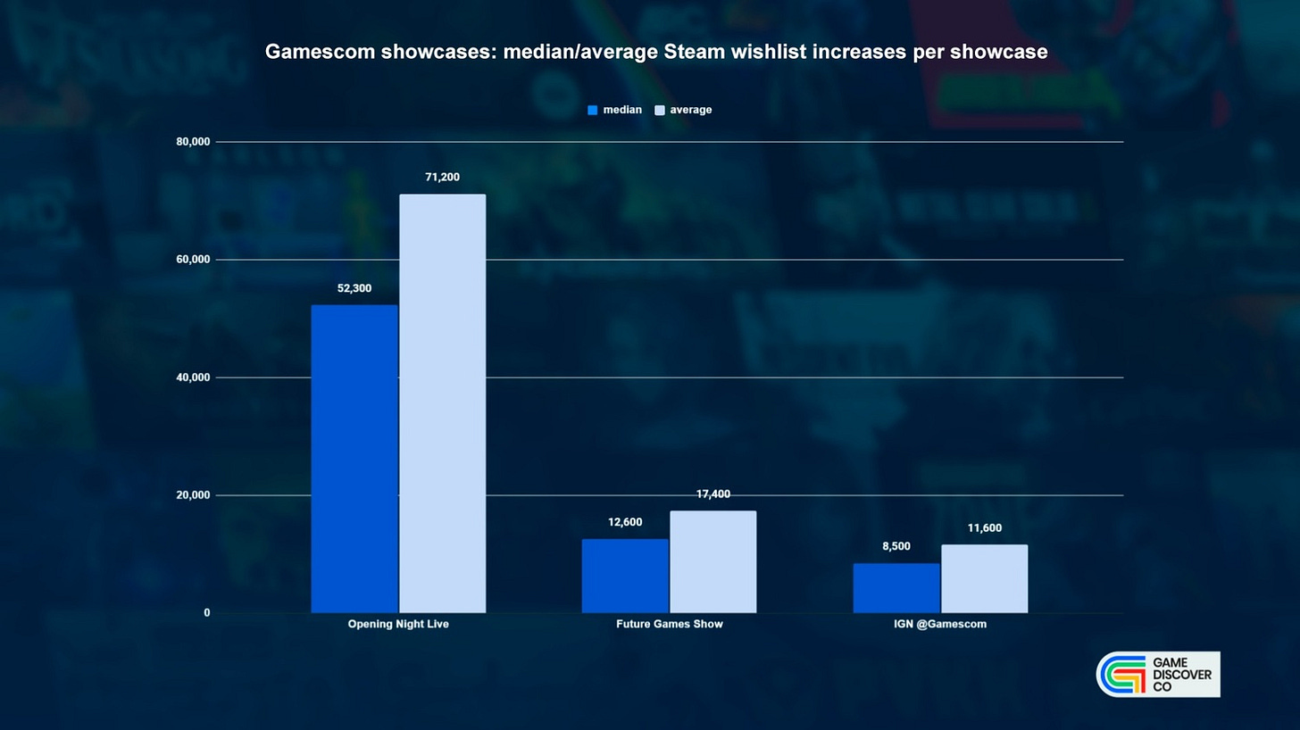 Finally, we did have a quick look at median/average Steam wishlist increases, across each showcase. Nothing surprising here, and there’s probably an argument for more Gamescom-timed showcases, since the field is relatively small right now:
