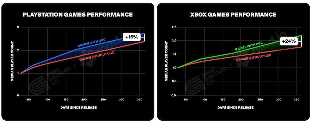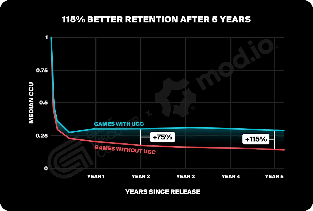 There’s some potential correlation-causation issues here - games that allow UGC may be of a genre that naturally has a better ‘long tail’. But UGC for less obvious fits like CRPGs can work - Larian’s Michael Douse told Mod.io that “after implementing official [Baldur’s Gate 3] mod support in 2024, we saw an increase of 20% DAU across all platforms”.