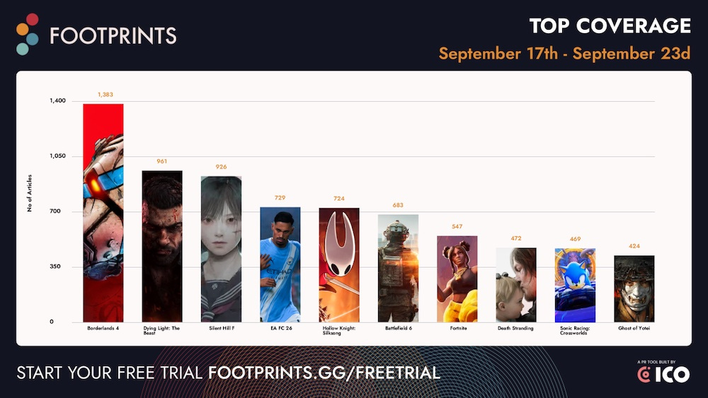 The latest Footprints.gg ‘trad media’ mention charts(above, Sept. 17th-23rd) see Borderlands 4 (>3m units sold on PC/console, per us!) still atop the charts, but with Dying Light: The Beast (also a decent performer) and the just-releasing Silent Hill F getting good buzz, too.