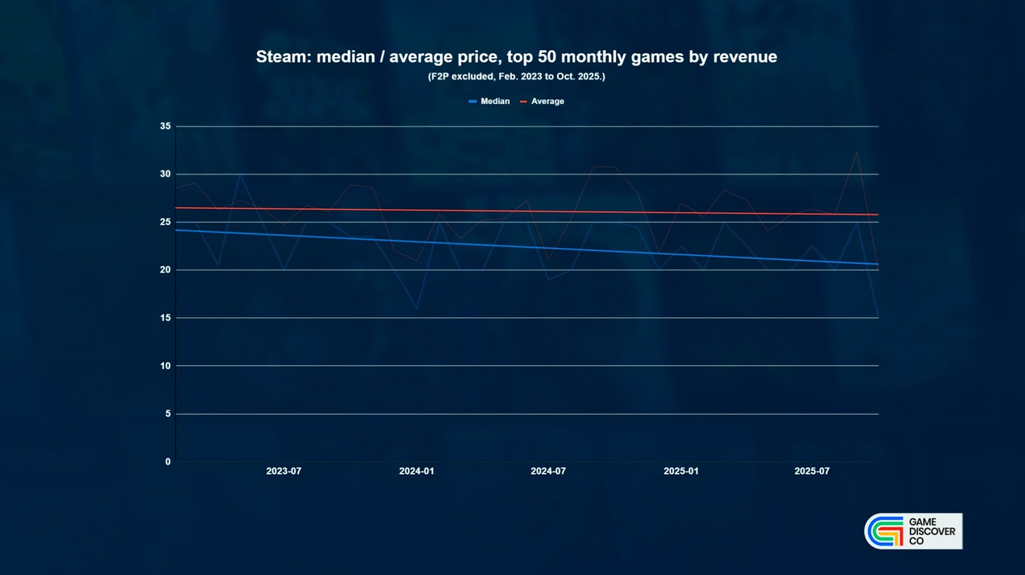The average Steam Top 50 (by launch revenue) game price starts at $26.20 (Feb. 2023) and ends at $25.76 (Oct. 2025), down 2%.