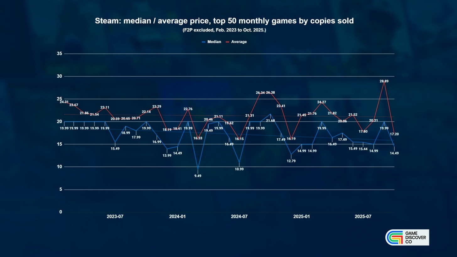 The median game price starts at $23.70 (Feb. 2023) and ends at $20.35 (Oct. 2025), down 14% (a tad less than the ‘copies sold’ result!)