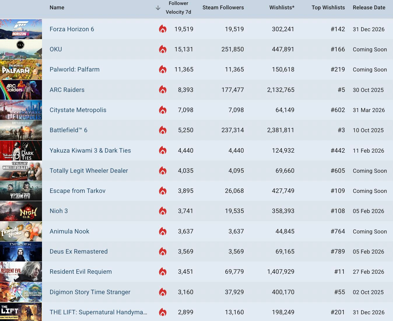 Checking GDCo’s ‘7-day trending’ unreleased Steam game follower chart (Sept. 22nd to 29th), Microsoft’s Japan-set racing franchise sequel Forza Horizon 6 hit #1 with a bullet as it got officially unveiled at Tokyo Game Show. Also new at #3 - Palworld: Palfarm - a cozy farming spinoff of the hit survival monster-collector.