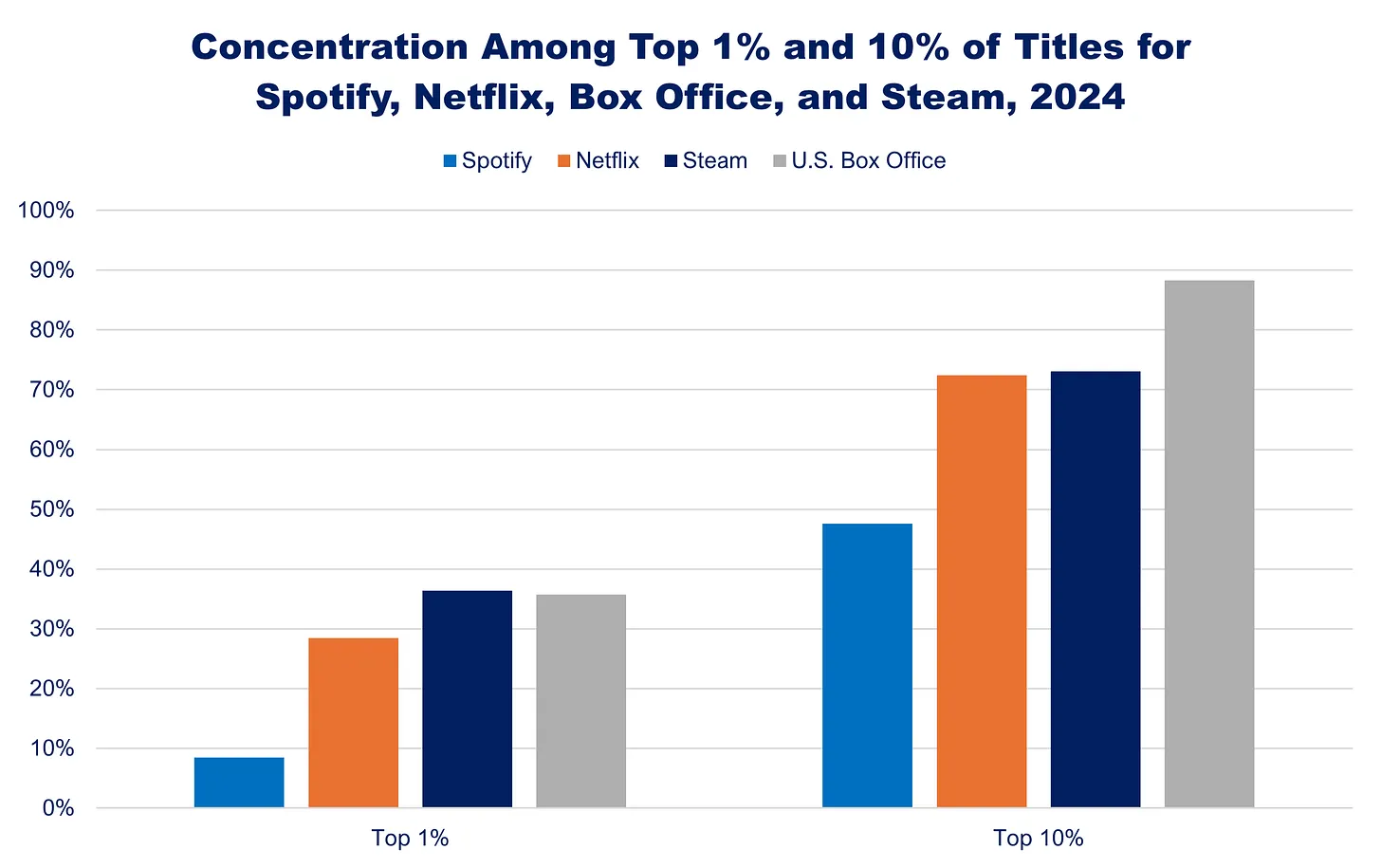 The graph above shows that across all audiovisual media - Spotify, Netflix, the U.S. film box office, and Steam - the top 1% of titles (except songs) capture about 30% of the attention, and the top 10% capture 50%-80% of the attention. (For Steam, he used the Top 1,000 titles and Steam CCU, btw, which is a representative cross-section.)
