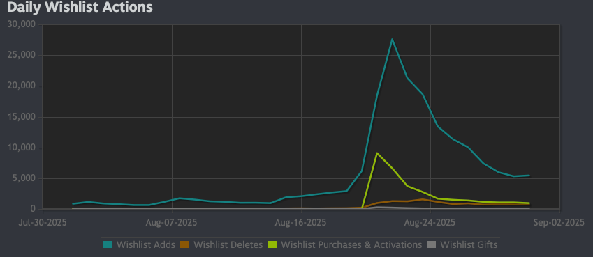 This snapshot of the game’s Steam wishlist actions in the few days before launch shows swelling wishlists, after the embargo lifted and a feature in the Future Games Show at Gamescom streaming showcase hit: