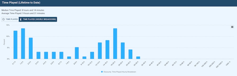 As a result, Discounty has ~300,000 cumulative Steam wishlists LTD, and the game’s Steam players by country are: USA – 39%, China – 9%, Germany – 8%, UK – 7%, Canada – 5%, France – 3%, Australia – 3%, Brazil – 2%, Spain – 2%, South Korea – 2%. (What we’d expect for a title like this that isn’t incredibly Asian-friendly.) Good stuff!
