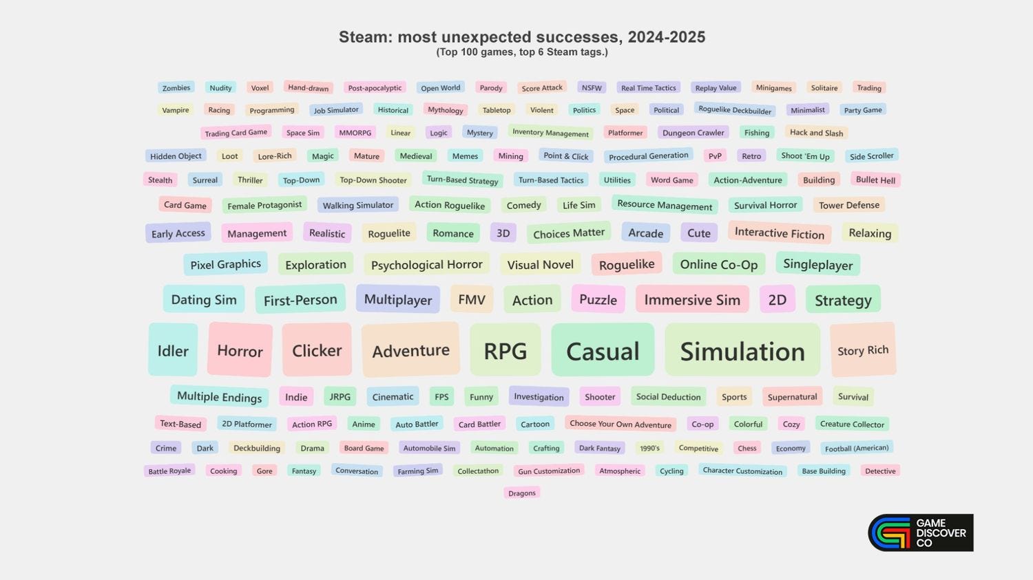 We’re not surprised to see genres like ‘Roguelike’ in here. But you might be surprised to see ‘Dating Sim’ or ‘FMV’. (That’s because of games like Heartbeat In Thailand and Road To Empress, which are China-first FMV dating titles continuing the Love Is All Around trend which often blow up post-release - here’s a guide for the curious.)