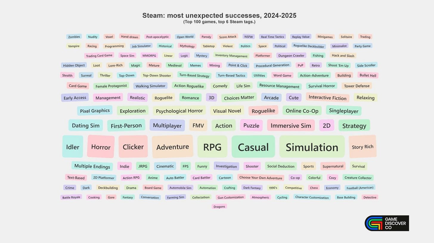 [WANT A FREE DEMO OF GDCo PRO? Studios, get a demo of our GameDiscoverCo Pro company-wide ‘Steam deep dive’ & console data by contacting us today-~90 orgs have it. Or, signing up to GDCo Plus gets the rest of this newsletter and Discord access, plus more. ]