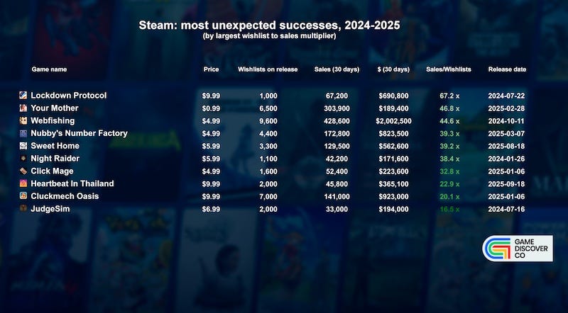 But taking the idea that ‘games with hardly any wishlists don’t suddenly sell great’, we searched our database to find titles that did. And here’s the top examples from 2024 and 2025, ranked by ‘30 day sales as a multiple of launch wishlists’: