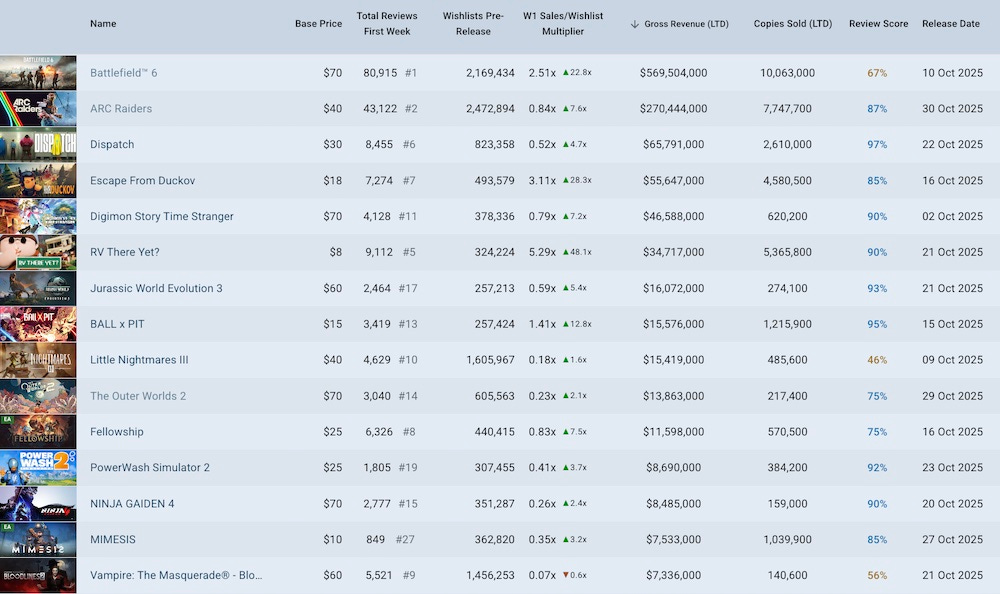 An example of conversion variance can be seen in October 2025’s top new Steam releases (below, with LTD copies sold & rev estimates from GameDiscoverCo Pro.) The 7-day ‘sales compared to wishlists’ metric varies by as much as 20x from the 0.11x median: