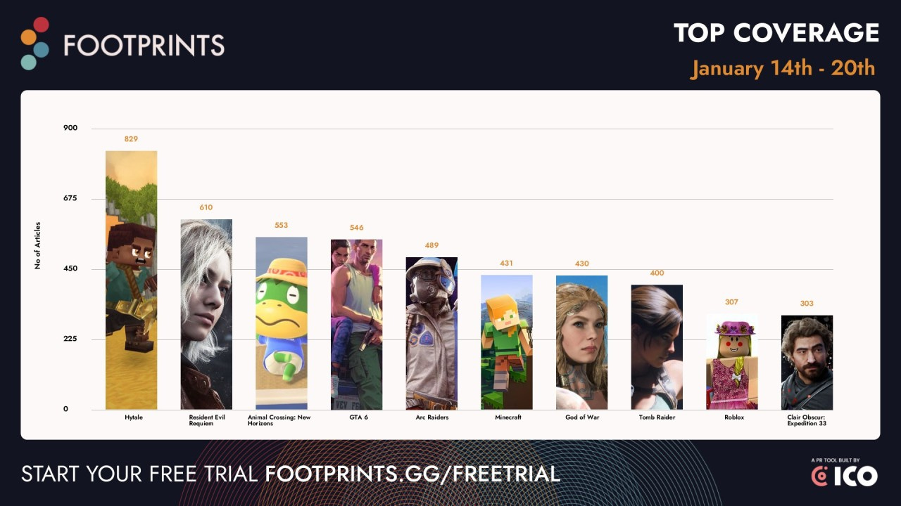 Our buddies at ‘trad PR’ monitoring tool Footprints.gg looked at the week’s top written media coverage, and Minecraft-like Hytale (on PC, not on Steam) tops the charts. Also hot: Resident Evil: Requiem, the Switch-exclusive Animal Crossing: New Horizons (due to a new patch), and GTA 6 (due to.. a boiler room explosion?)